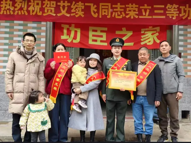 为弘扬拥军优属的优良传统,让军人军属共享荣誉、倍感尊崇,1月26日上午,玉山县相关领导与工作人员带着立功喜报,敲锣打鼓来到现役军人艾续飞同志家中,为他和家人送上部队的嘉奖与家乡的祝福,让“一人立功,全家光荣,全乡自豪”的荣誉感满溢乡村。