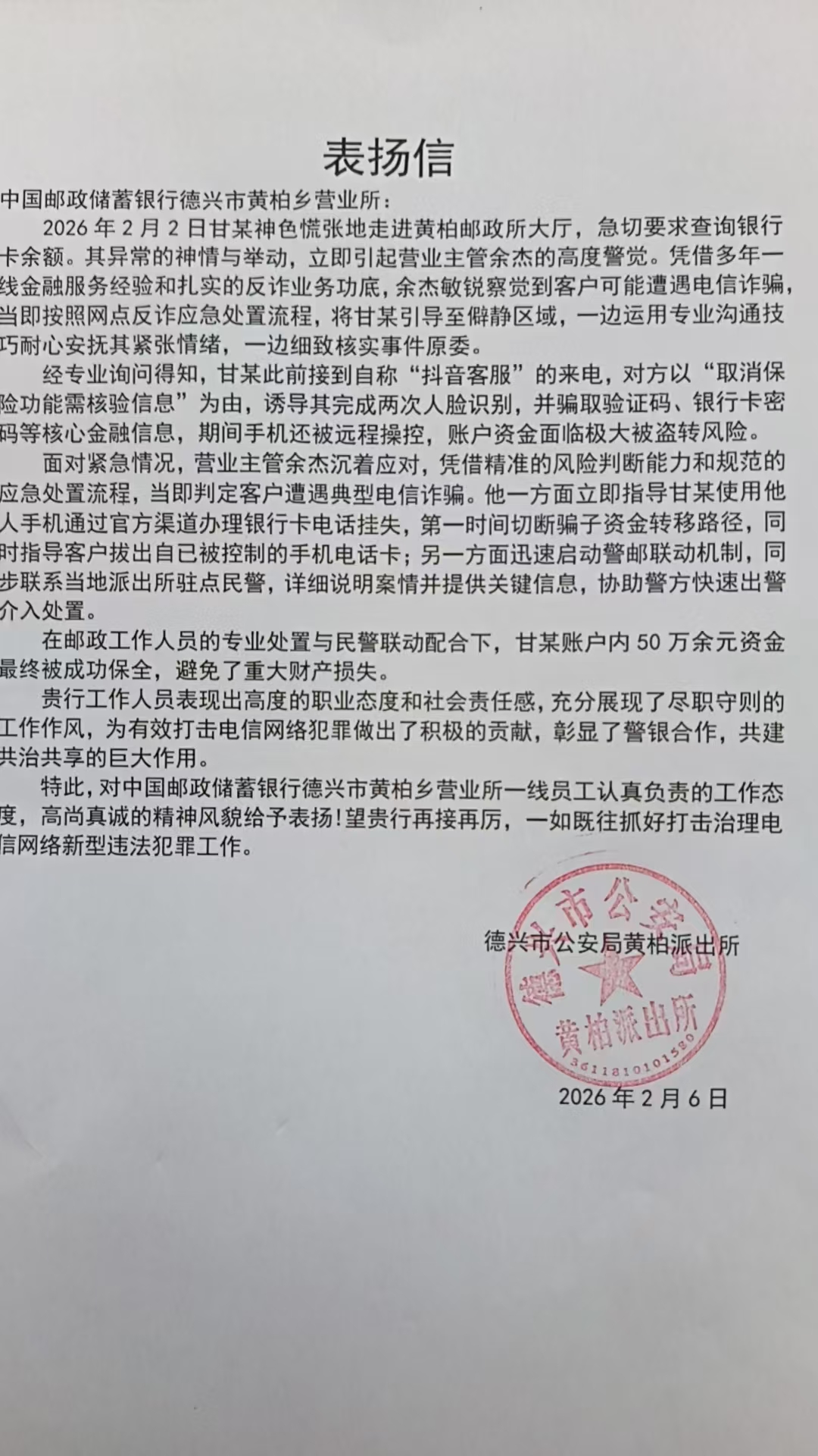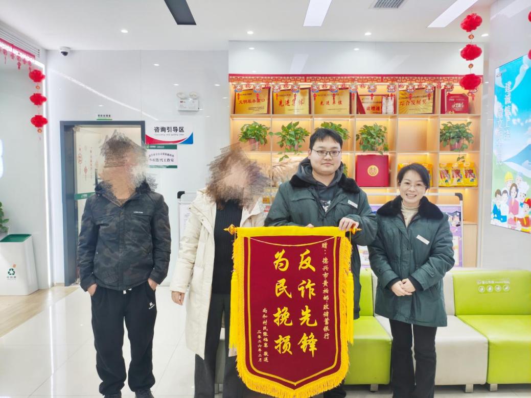 2月5日下午,德兴市黄柏乡邮政所内,客户张某将一面印有“反诈先锋 为民挽损”的锦旗郑重送到工作人员手中,字里行间满是对邮政人专业处置、守护群众财产安全的由衷感谢。这面锦旗的背后,是德兴市邮政分公司工作人员凭借专业素养与责任担当,成功拦截一起50万余元电信诈骗案件的暖心实践。
