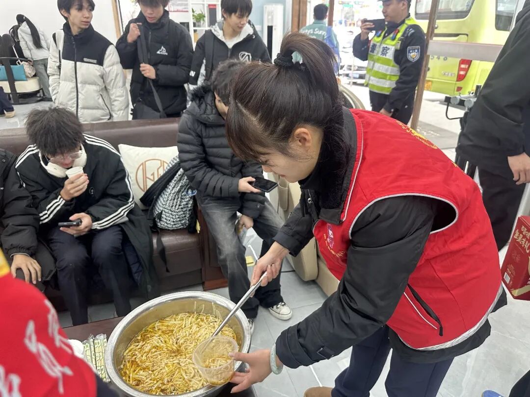 接到通知后,值班站长立即启动应急处置预案,依托工会驿站与员工食堂两大服务阵地,迅速组织工作人员开展接待准备工作。站内开放工会驿站供孩子们休息取暖,同时启用员工食堂紧急备餐,为51名学生端上热气腾腾的面条,递上暖心暖胃的姜茶。