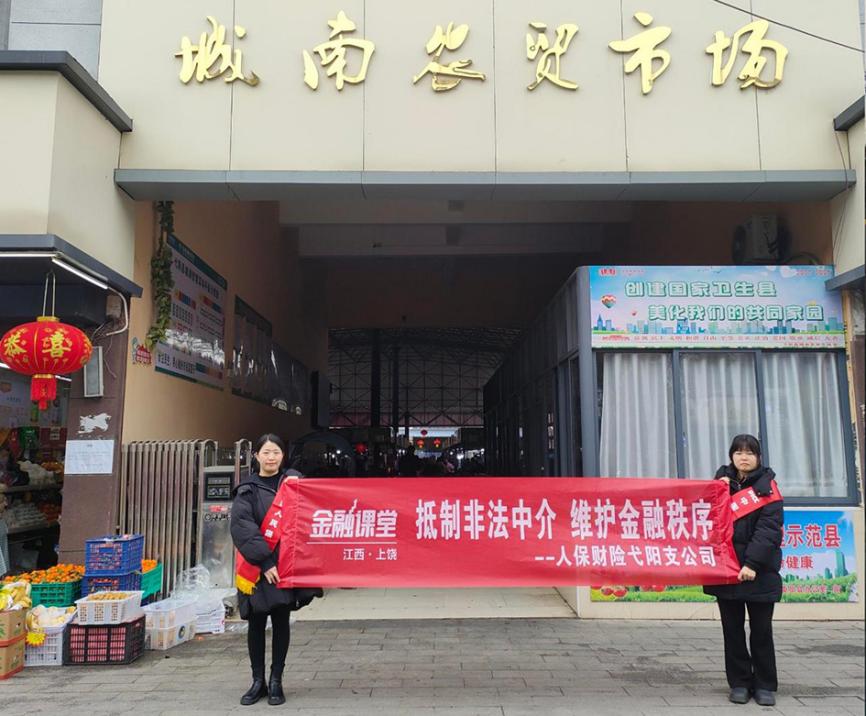 人保财险弋阳支公司面向社会公众,以“抵制非法中介,维护金融秩序”为主题,开展多形式、广覆盖的宣传教育。依托营业网点设立宣传专区,摆放展板、发放折页,向客户讲解非法中介识别要点;走进乡村、商圈,面向老年群体、小微企业主等重点人群,普及正规投保、保单服务、维权渠道等知识,提醒公众警惕“全额退保”“代办理赔”等陷阱,引导通过官方客服、正规网点、持牌机构办理业务,依法理性维权。