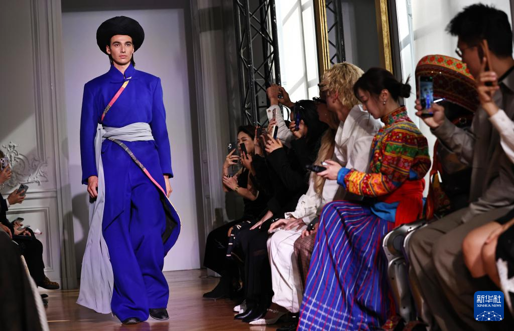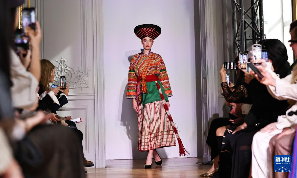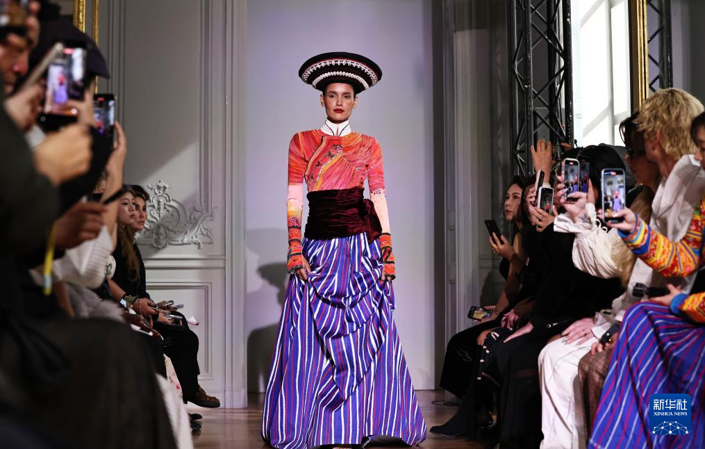 10月1日,在法国巴黎中国文化中心举行的第三届中法时装周上,模特在“非遗四川·百城百艺”盐边·傈僳族服饰时尚秀上展示服装。