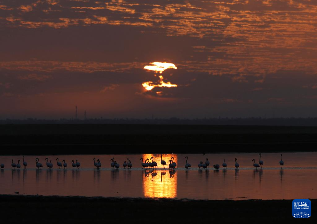 这是12月6日日出时分在埃及法尤姆省加龙湖拍摄的火烈鸟。