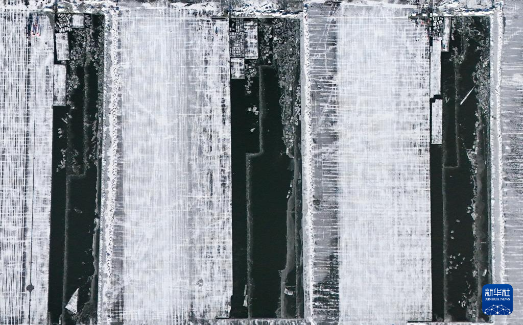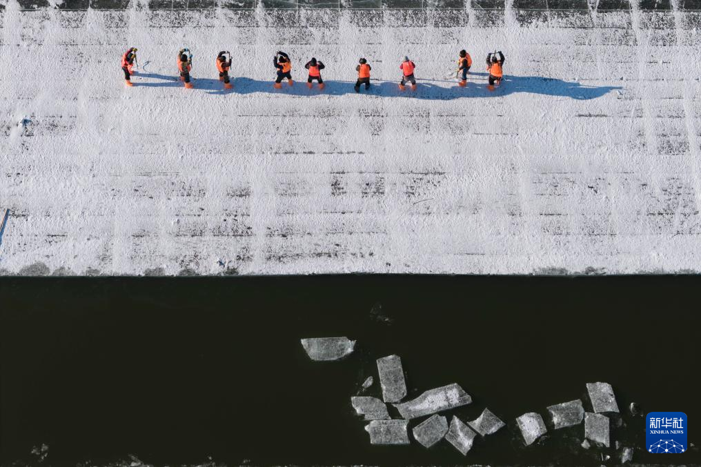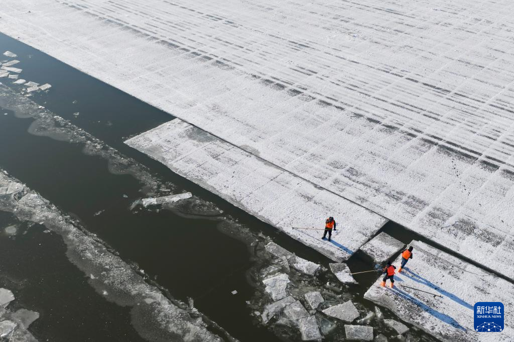 12月9日,工人在松花江哈尔滨段采冰(无人机照片)。