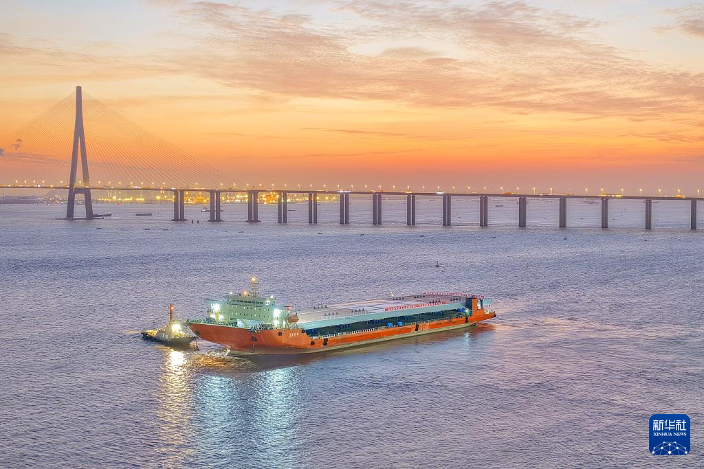 12月9日,厦金大桥(厦门段)大节段钢箱梁在江苏南通振华重装码头发运(无人机照片)。