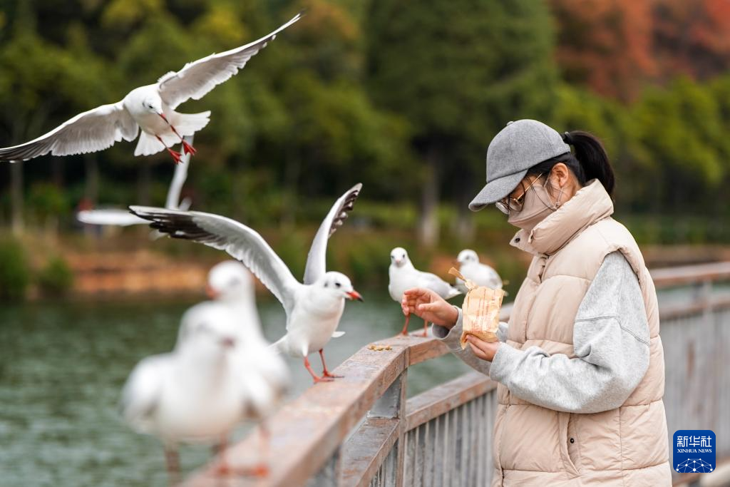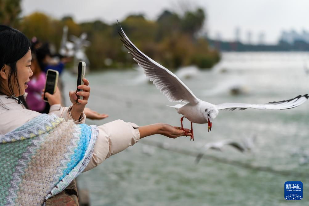 12月10日,游客在滇池畔的海洪湿地公园喂红嘴鸥(无人机照片)。