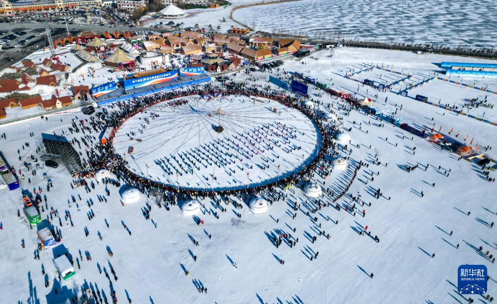 1月8日,在吉林省松原市,人们参加吉林·查干湖第24届冰雪渔猎文化旅游节开幕式(无人机照片)。