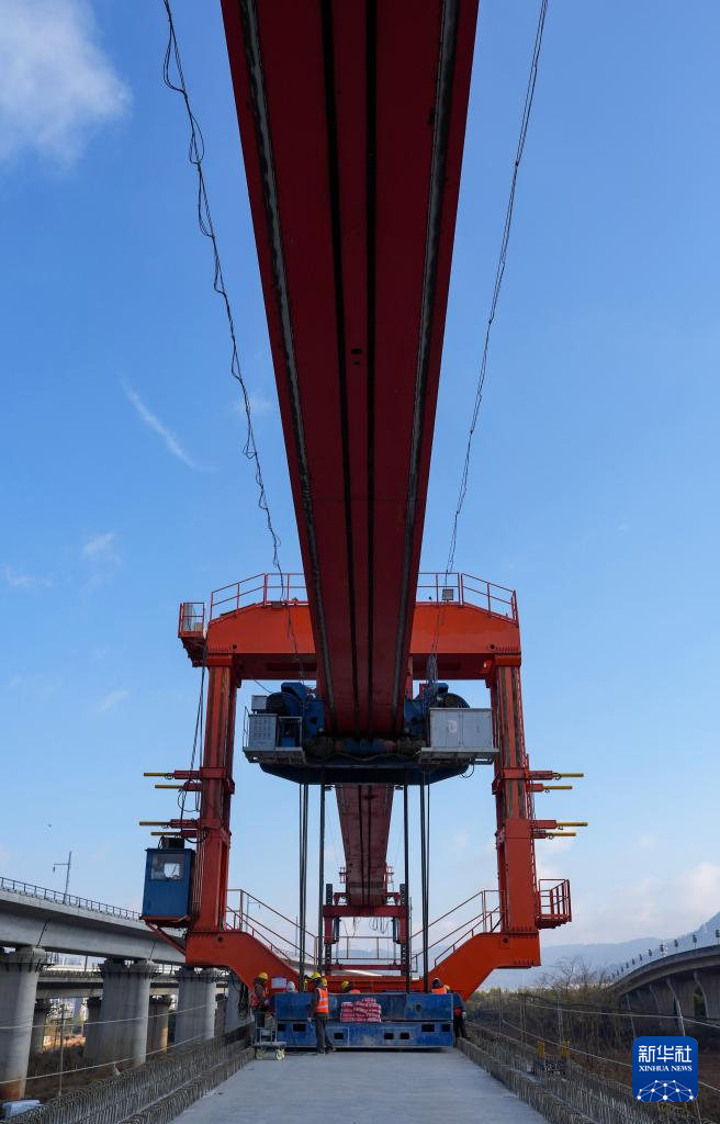 这是2月3日拍摄的渝昆高铁最后一榀箱梁架设施工现场(无人机照片)。