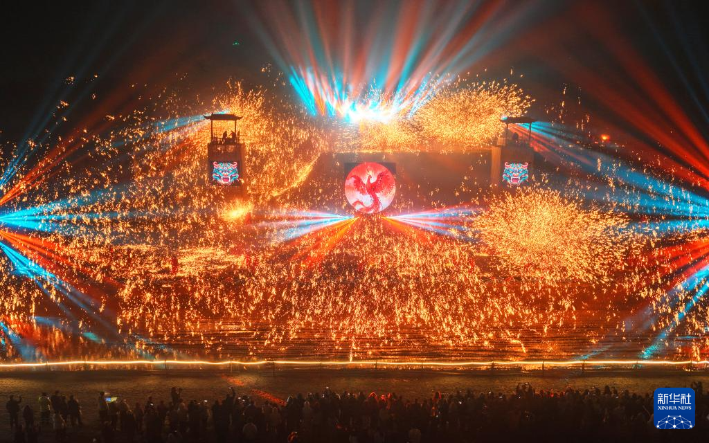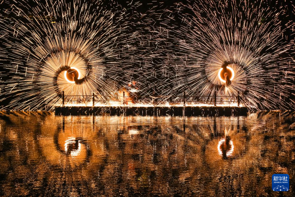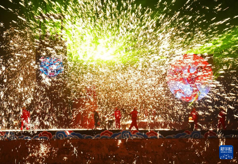 2月13日,在湖南省衡阳市南岳区1944景区,民间艺人表演打铁花(无人机照片)。