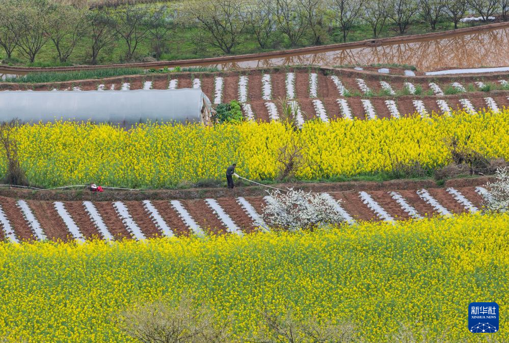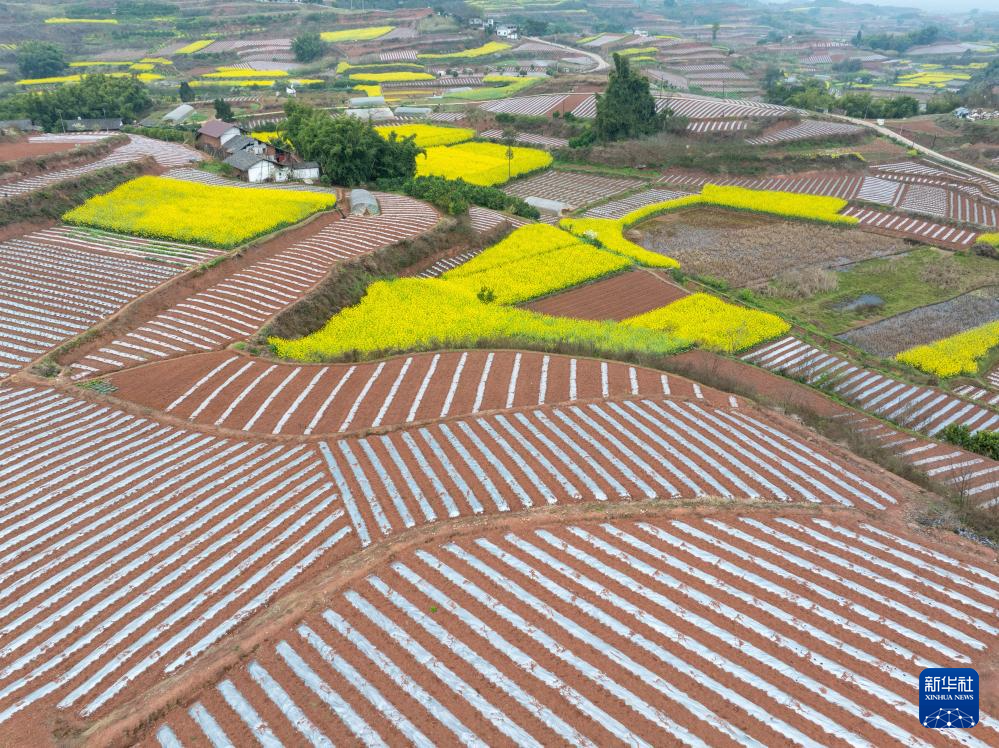 春意渐浓,四川省自贡市荣县乐德镇天宫庙村的村民开始覆地膜、种辣椒等,为春耕做准备。天宫庙村因土壤中富含铁泥质砂岩而呈赭红色,成为远近闻名的“乐德红土地”,赭红色的土壤、金黄的油菜花等形成的不同色块、线条在大地交织,形成大地的“调色板”。