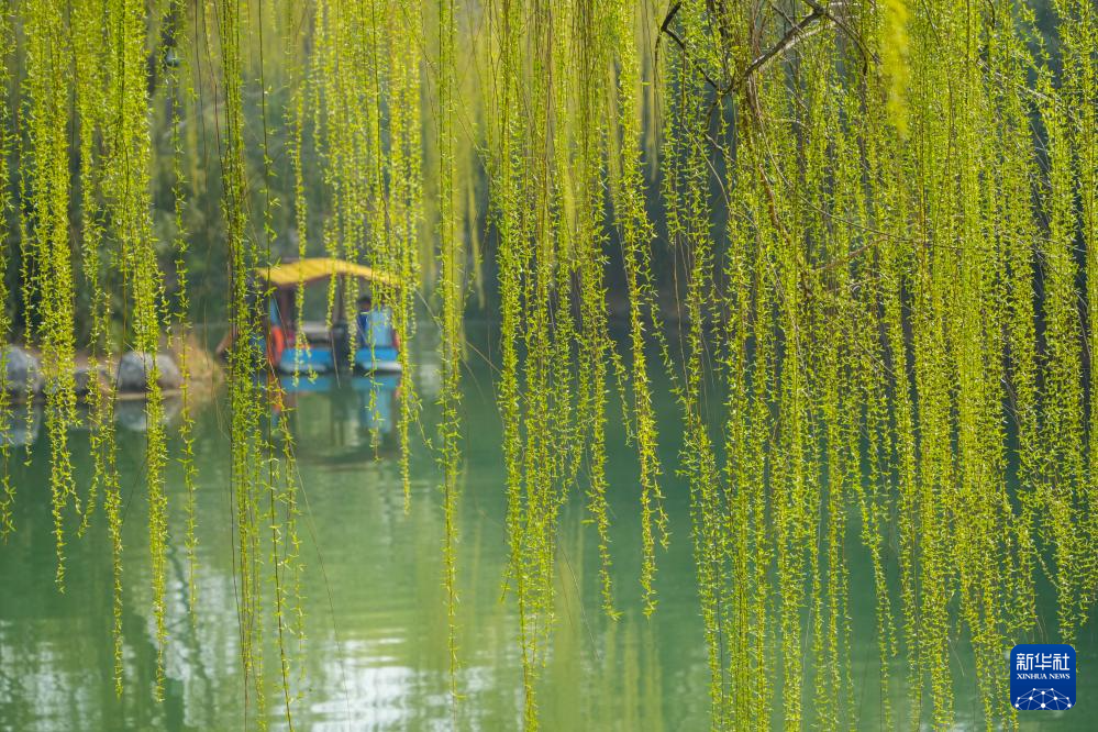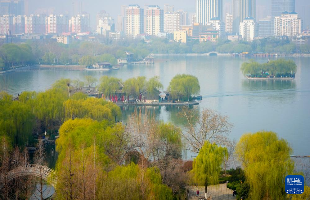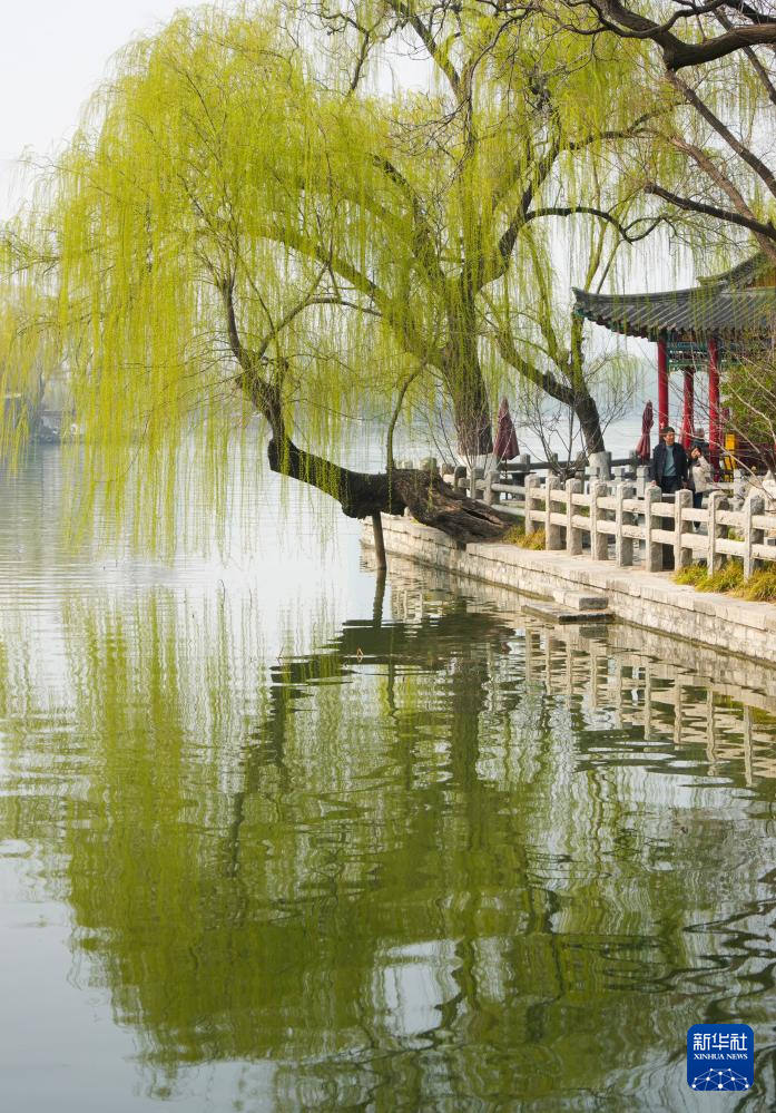近日,山东省济南市气温回升,大明湖畔的柳树披上新绿,吸引游客前来踏春游览。大明湖位于济南市区,湖岸种有大量柳树,以“四面荷花三面柳,一城山色半城湖”的风光闻名。