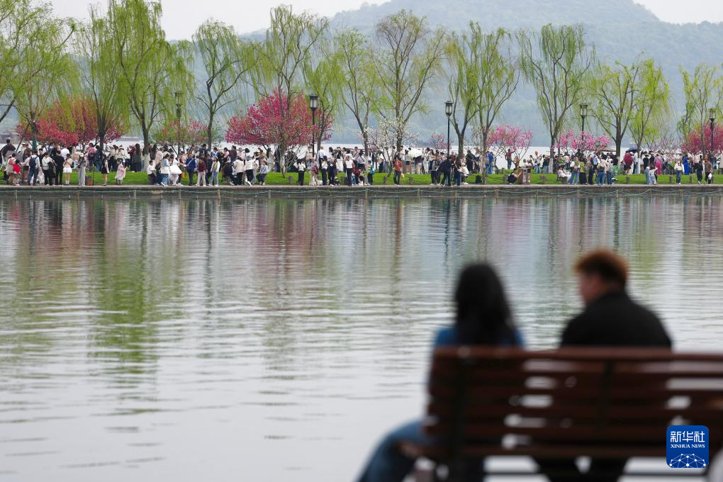 近日,浙江杭州西湖景区呈现出桃红柳绿的春日丽景,吸引市民和游客前来观赏。