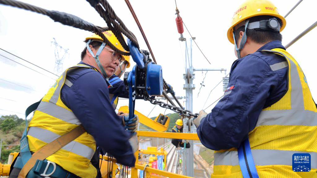 4月23日,施工人员对南珠高铁玉岑段的接触网导线进行加固。